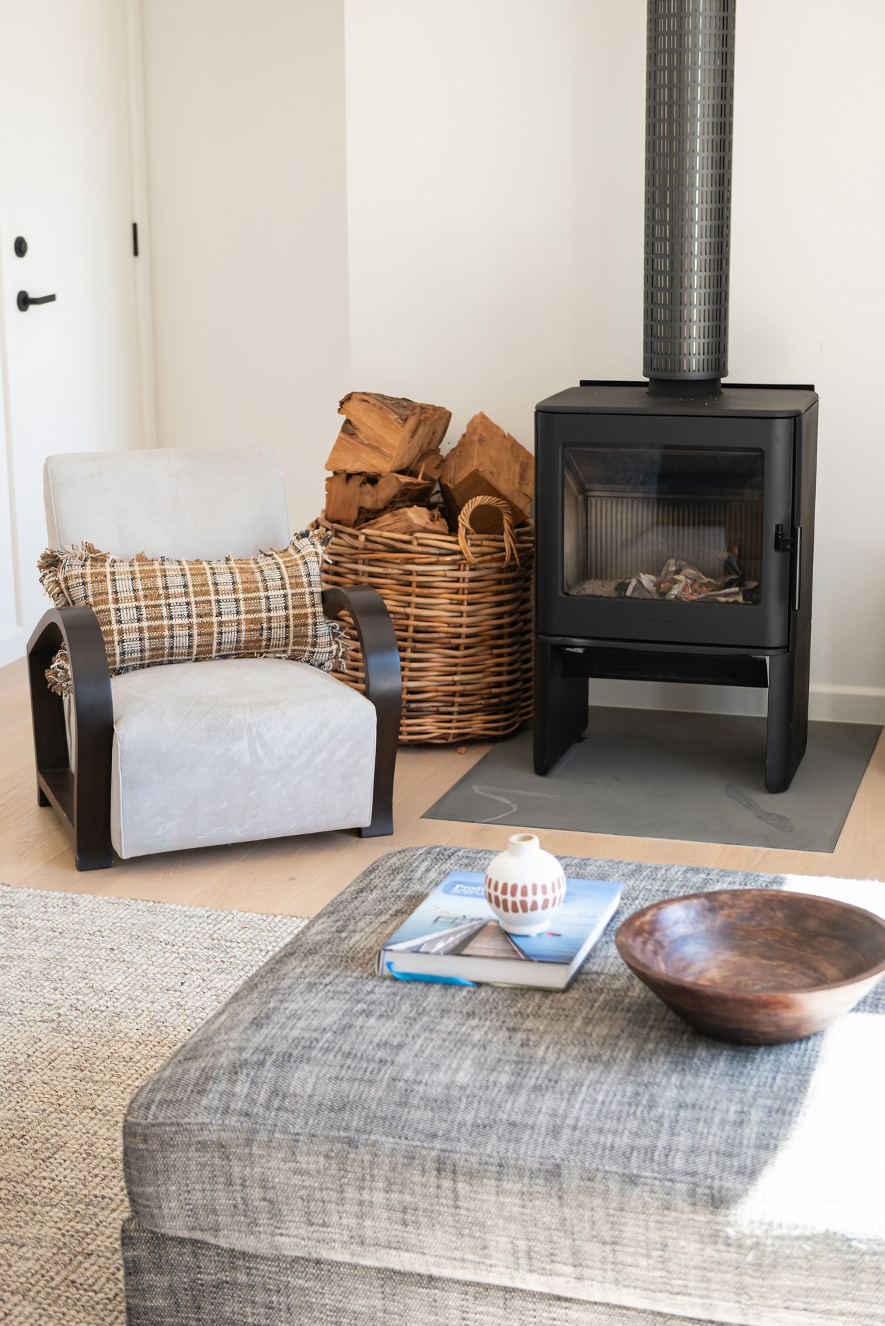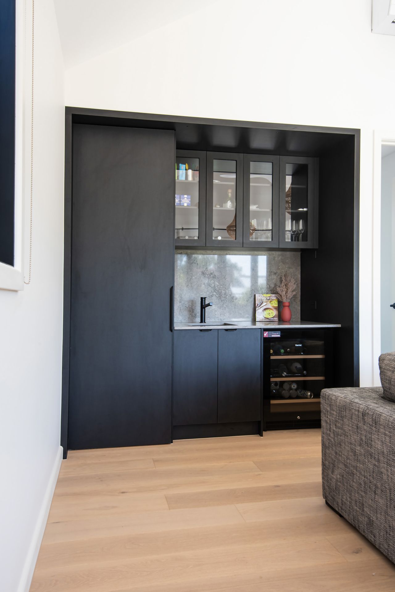 The heart of the new extension is the light-filled main living area. Floor-to-ceiling windows frame views of the backyard, bringing the outdoors in. Relax by the warm wood fireplace in cooler months, enjoy the year-round comfort of air conditioning, or entertain at the chic bar.