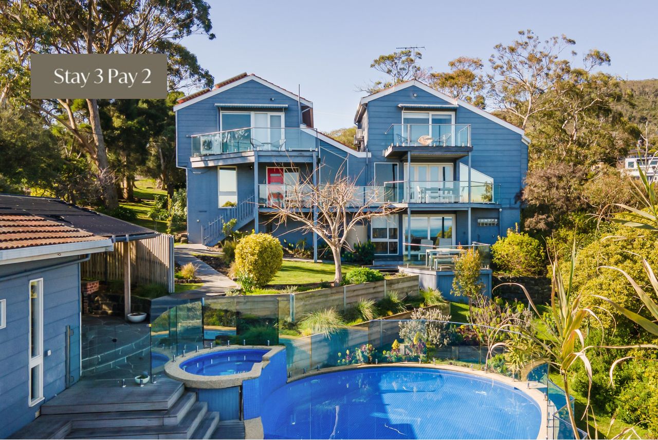 Bay Views from Drury Lane is a large, 9-bedroom house with breathtaking bay views, a large solar-heated pool, and a gas-heated spa. Sleeping 25 people in 24 comfortable beds, spanning over 3 levels, all fully air-conditioned, it really is special.