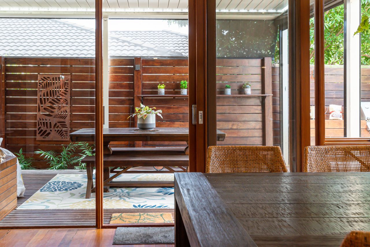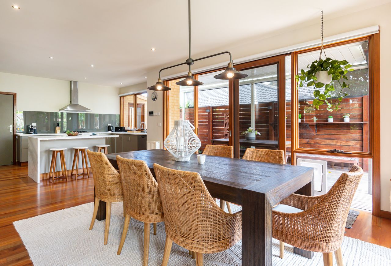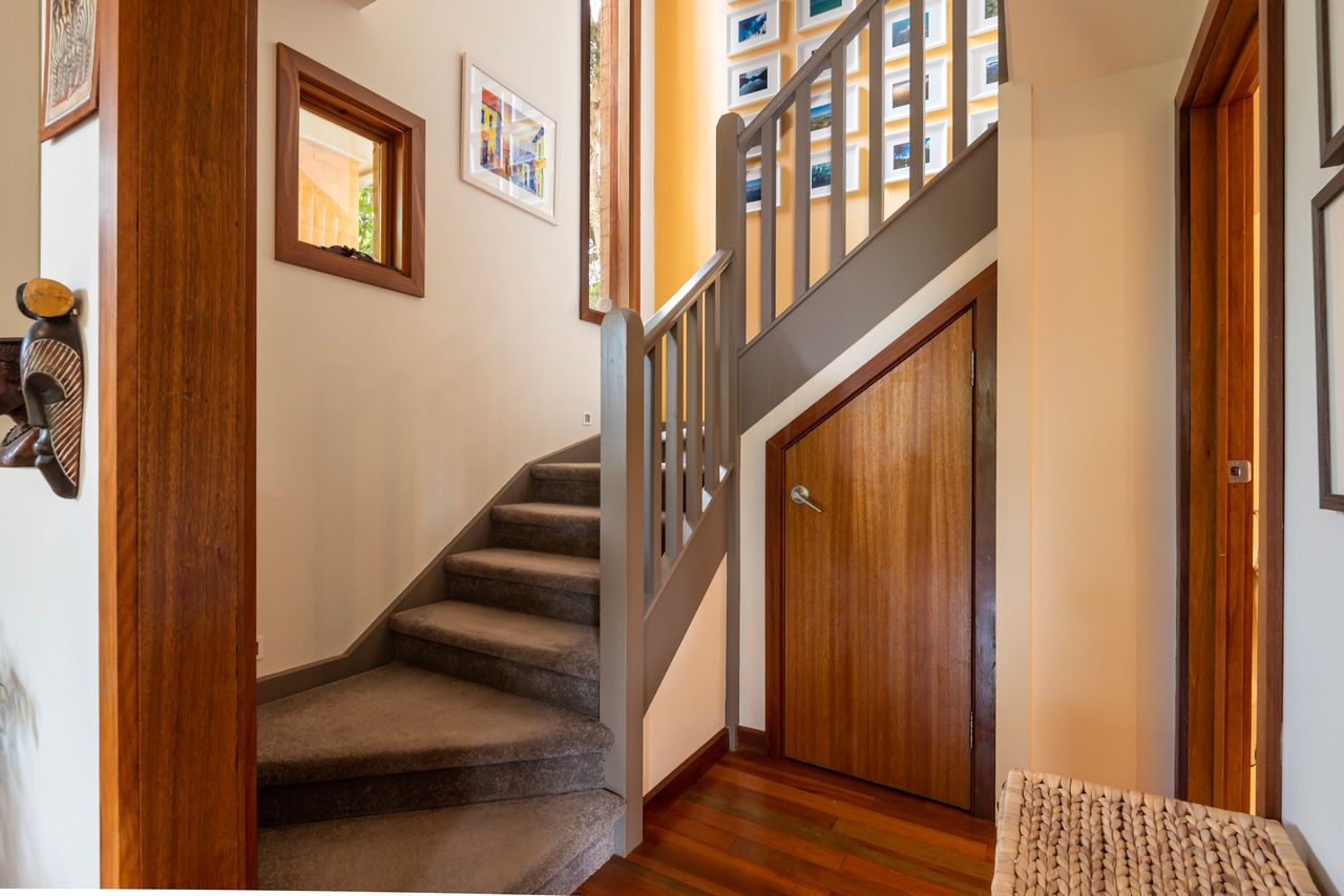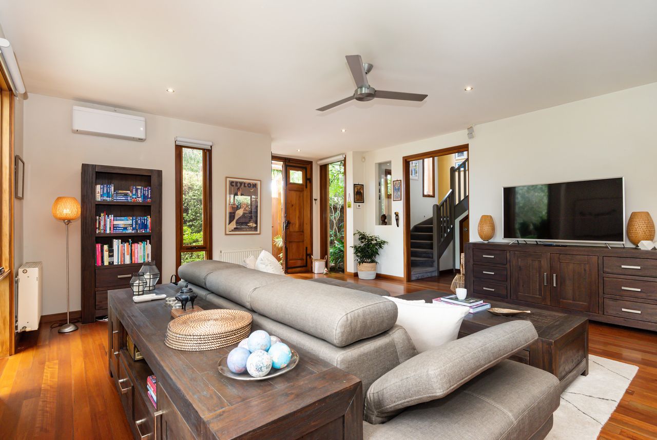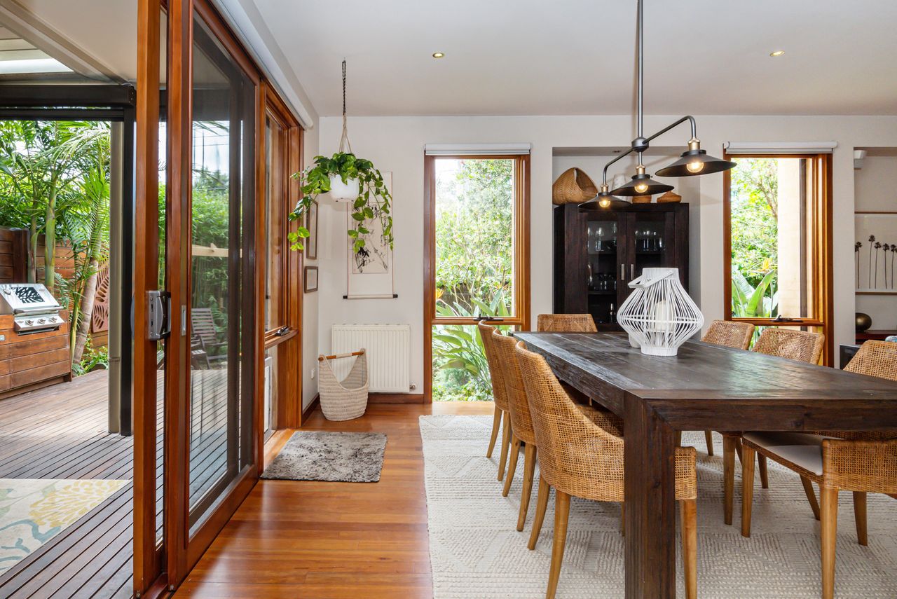 Bathed in natural light, this open-plan living and dining area features warm timber accents and enchanting leafy views from almost every angle. A smart TV enhances the space, while the seamless flow to a private covered alfresco area, large deck with a built-in BBQ, and tranquil garden oasis creates the perfect setting for both indoor and outdoor entertaining.