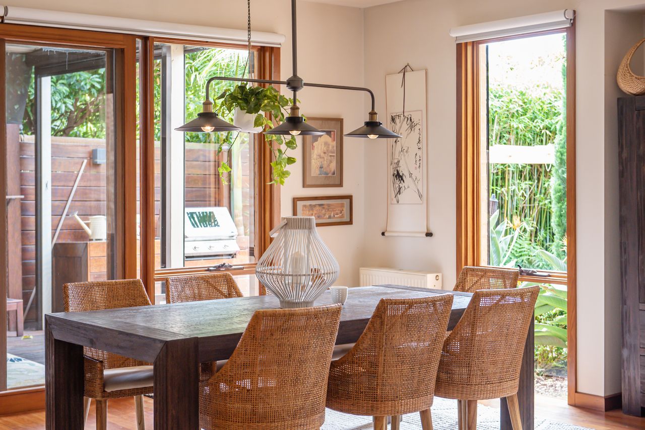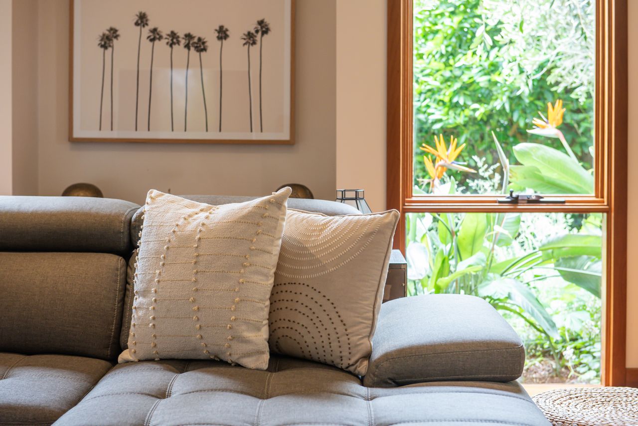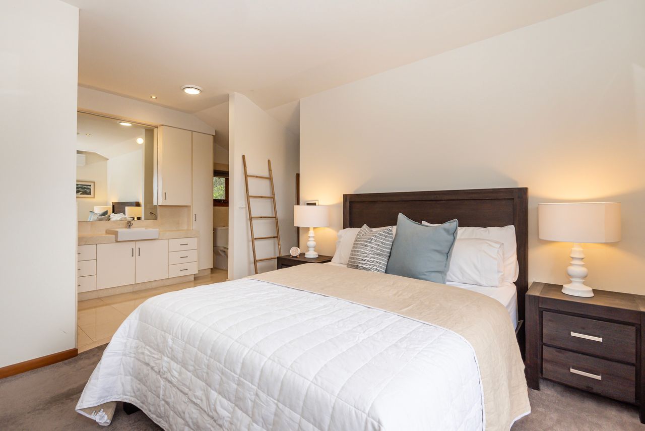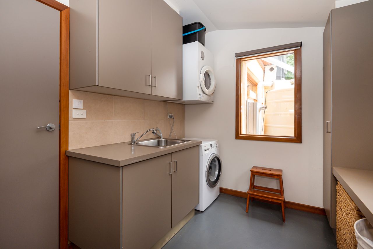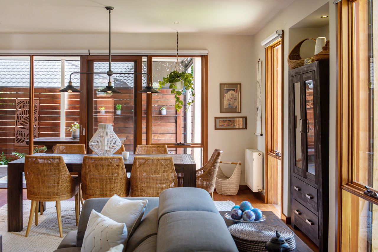 Bathed in natural light, this open-plan living and dining area features warm timber accents and enchanting leafy views from almost every angle. A smart TV enhances the space, while the seamless flow to a private covered alfresco area, large deck with a built-in BBQ, and tranquil garden oasis creates the perfect setting for both indoor and outdoor entertaining.