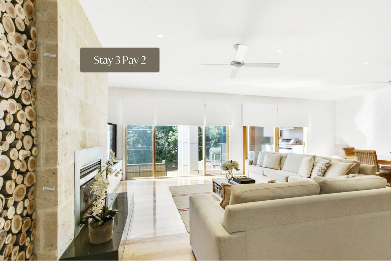Experience the ultimate luxury getaway at this stunning two-level beachside holiday home. Designed with comfort and style in mind, this property offers two spacious living areas with a cozy open fireplace, perfect for relaxing evenings. A chef’s kitchen with premium appliances flows seamlessly to alfresco area featuring a BBQ, TV, and built-in wine cooler.
