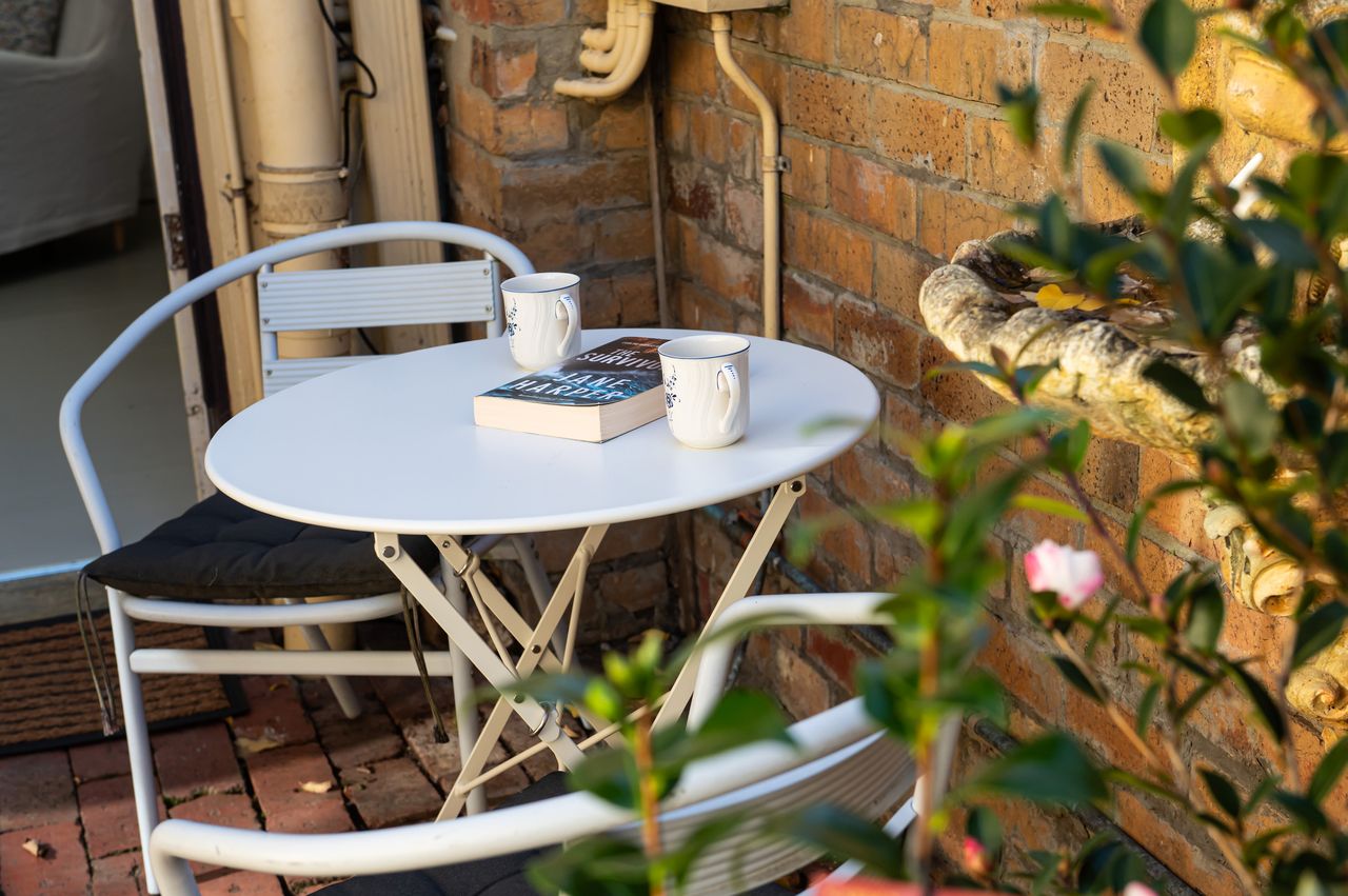 Small outdoor courtyard with seating for 2 great place to enjoy a morning coffee.