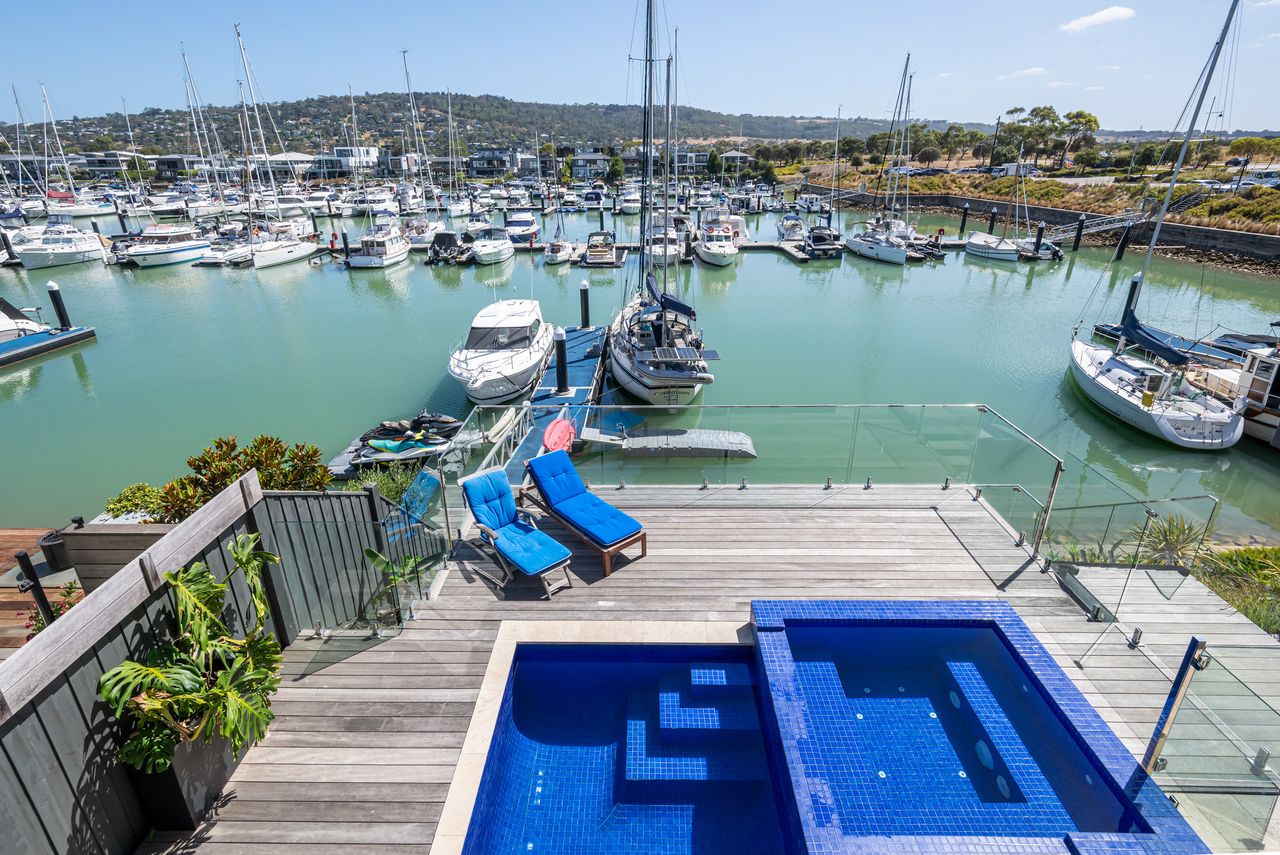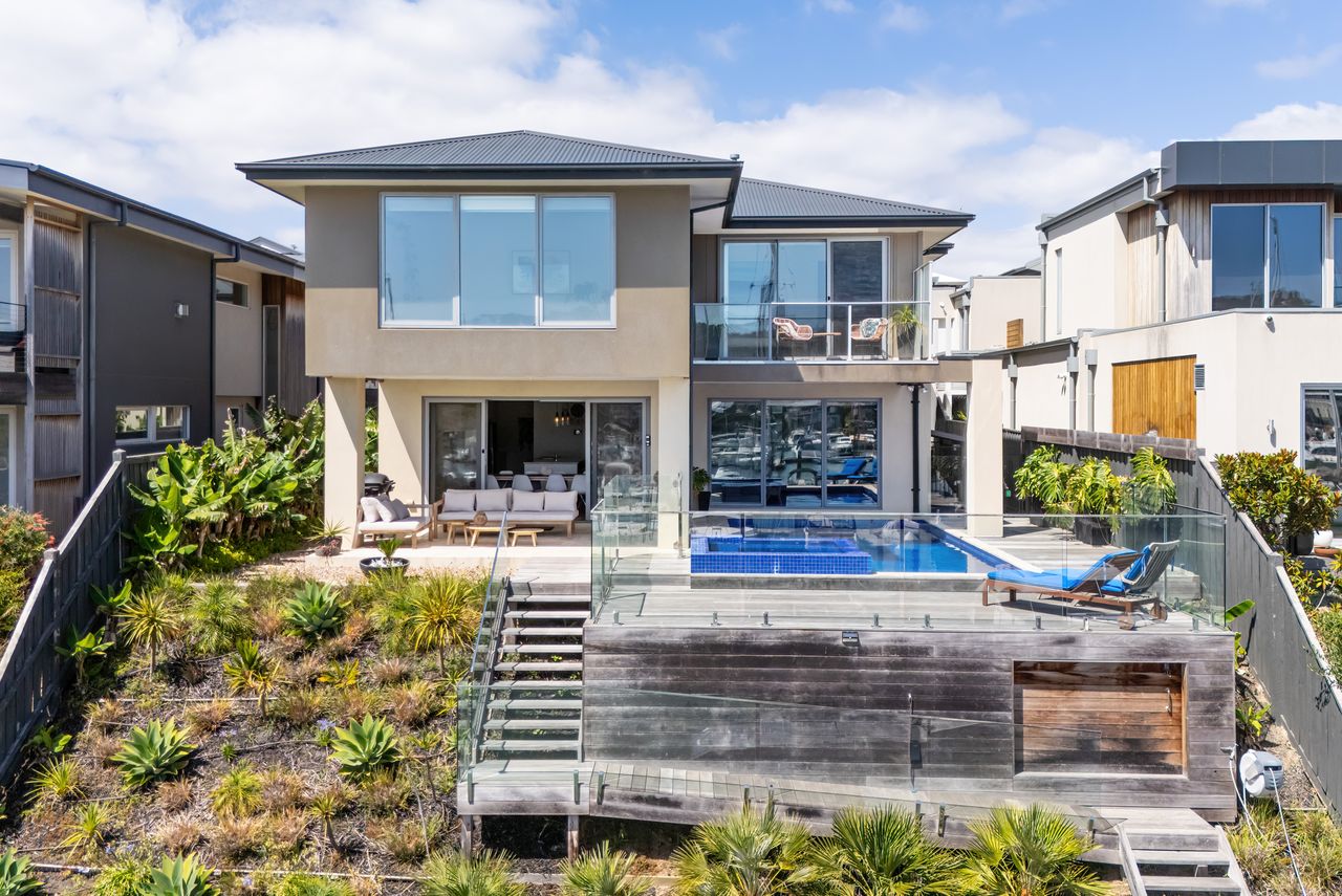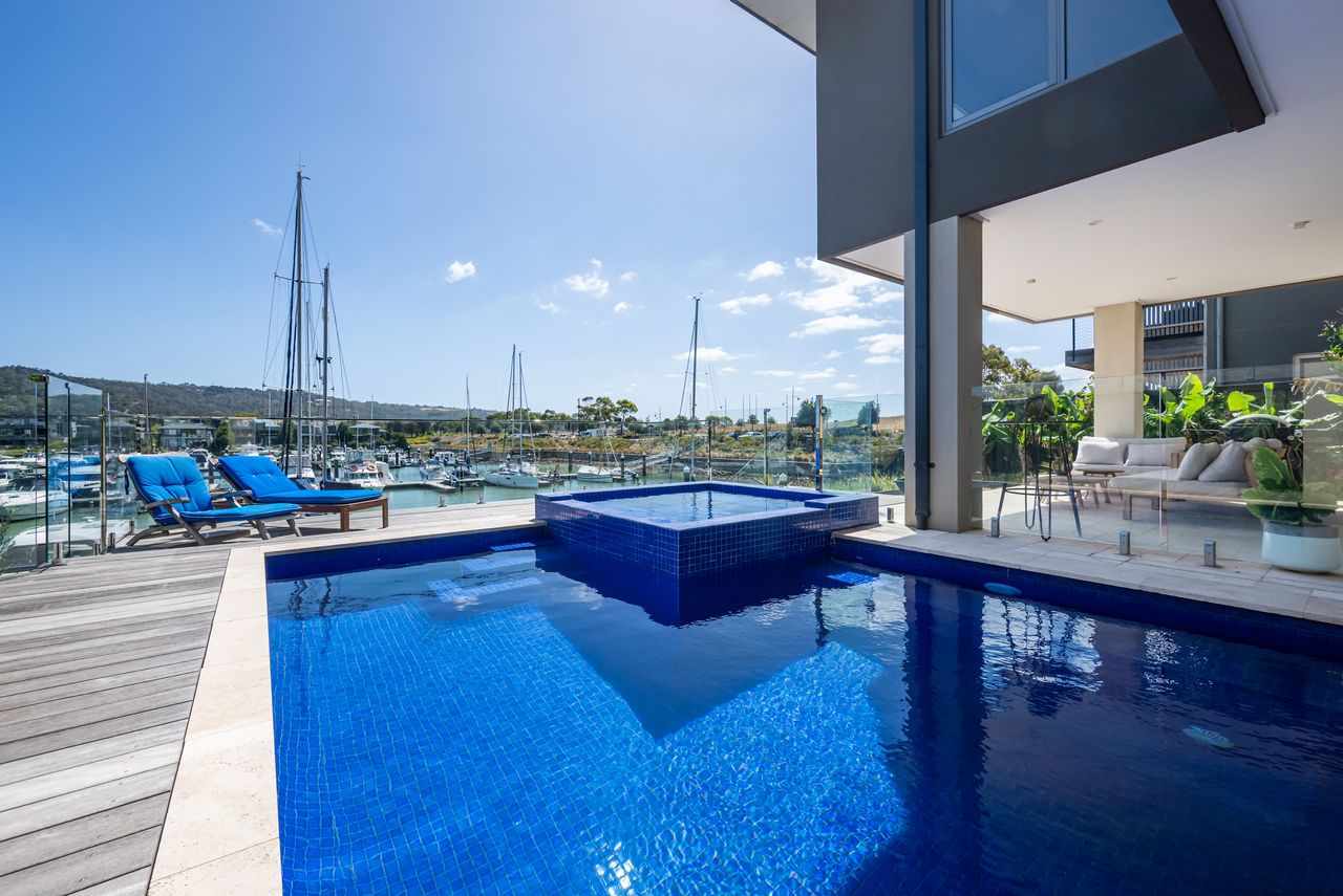 Waterside at Martha Cove — absolute marina frontage in Safety Beach. With 4 bedrooms, 3.5 bathrooms, solar heated pool and gas heated spa. Off street parking for up to 4 cars. This property is not suited to small children or pets